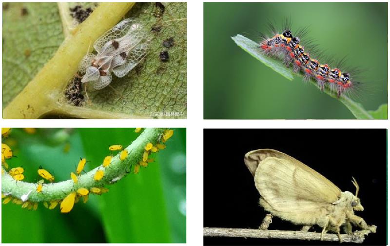 方翅網蝽、松毛蟲、青蟲、食心蟲、棉鈴蟲等。